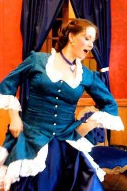 Mercy Otis Warren: Mother of the Revolution is a one-act monologue play that was born partly out of a love for period costumery. I’d purchased a damaged blue gown at the San Francisco Opera warehouse sale, and though it was tattered and looked like it had been designed for a haunted shipwreck scene, something about the dress spoke to me. Years later I had finally repaired the sleeves, and found the right silk stockings, and the right stays to fit me, and the correct side panniers—all without quite knowing what I would do with the costume!
